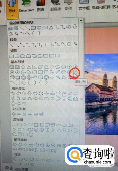 之后点击插入形状中的“圆柱形”。