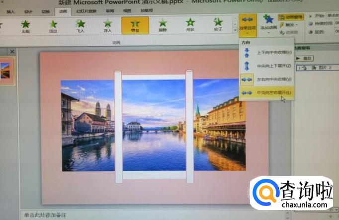 选中图片,添加劈裂动画并选择效果为中央向两侧展开,之后设置此动画的的持续时间为5s。