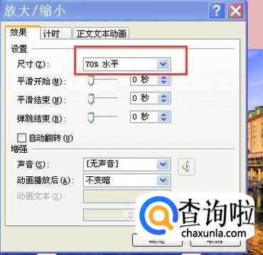 选中两个圆柱形,点击添加动画,选择“放大或缩小”,效果选项为方向水平,效果设置尺寸为70%(根据实际情况来调整),如下图所示。