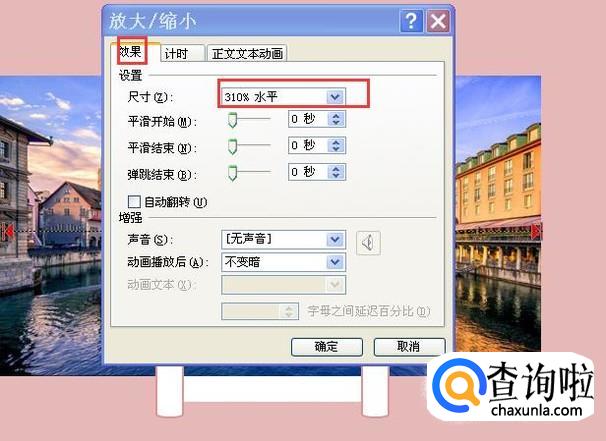 选中矩形框,添加动画为“放大或缩小”,效果选项为方向水平,效果设置尺寸设置为310%,也可以适当大一些。