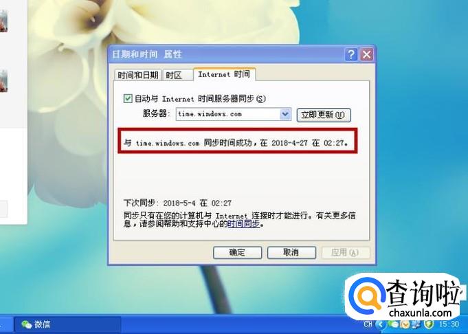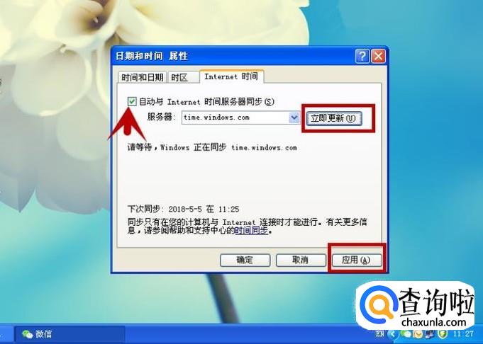 选择“Internet"时间,点击“立即更新”,系统就会直接自动更新时间,点击“应用”,屏幕右下角的时间便会自动更新时间。为了保证每次电脑开机后时间正确,可勾选”启动时与Internet时间服务器同步。