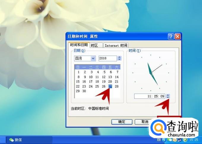 弹出”日期和时间 属性“,在”时间和日期“选项中用鼠标点击正确的日期和时间,然后点击”应用“按钮,时间就调整成功了。