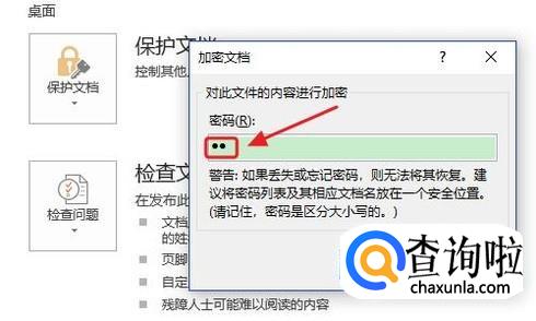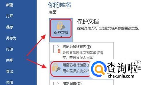 接着我们点击保护文档左侧的“保护文档”-“用密码进行加密”,然后连续两次给文档设定一个密码即可,具体流程如下...