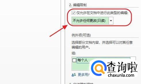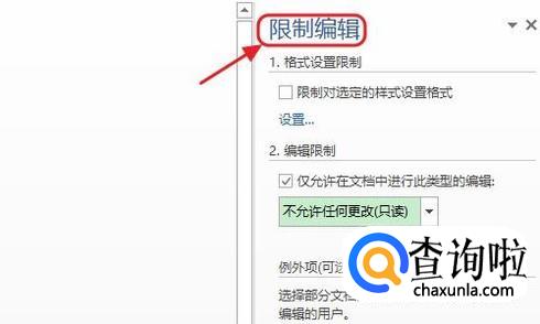 紧接着会在文档的右侧弹出限制编辑窗口,我们勾选其中的“仅允许在文档中进行此类型的编辑”,然后对应的下方设置为“不允许任何更改(只读)”