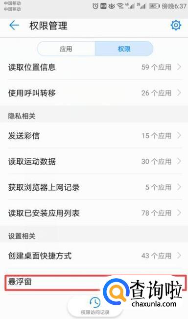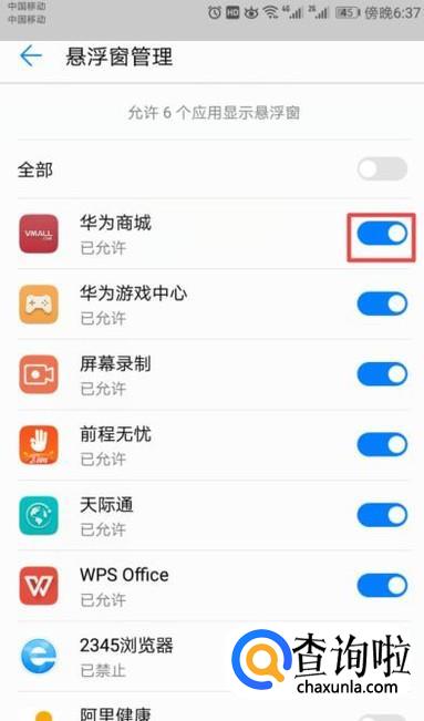 弹出的界面,我们将应用的开关向右滑动就可以开启悬浮窗了。