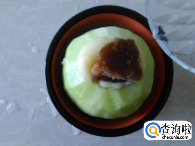然后把绿豆沙倒到香瓜里面。