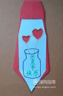 把写好祝福的彩纸,用剪刀剪出两个心形,粘贴在折纸领带上。这样折纸领带看起来生动形象,色彩也更加丰富。