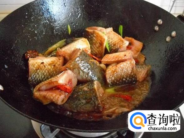锅中倒入适量油,把梭鱼段倒入,煎至表皮变黄