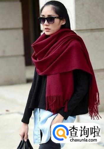 这种方法很简单,不需要折叠围巾,直接把围巾套头,一长一短即可,然后把长的一端平铺上来搭在肩上。