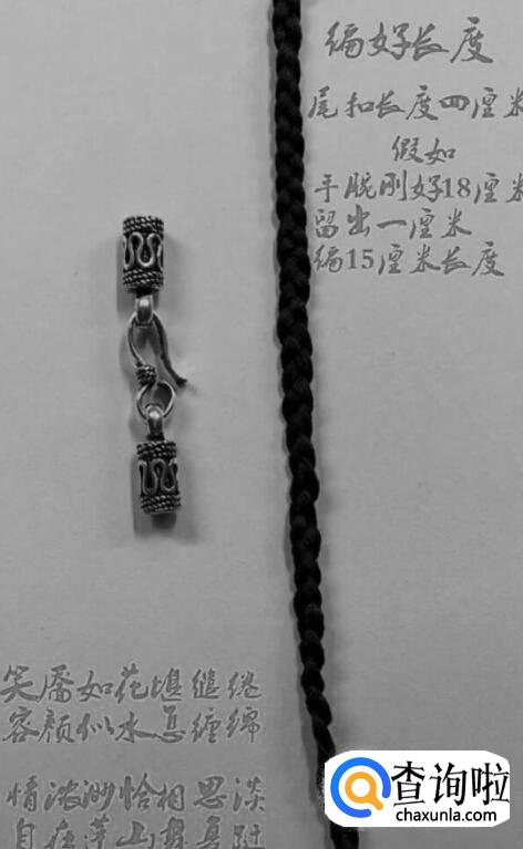 编三股辫子,尾扣长度四厘米,长度根据手腕大小而定,假如手腕刚好18厘米,留出一厘米编15厘米长度。