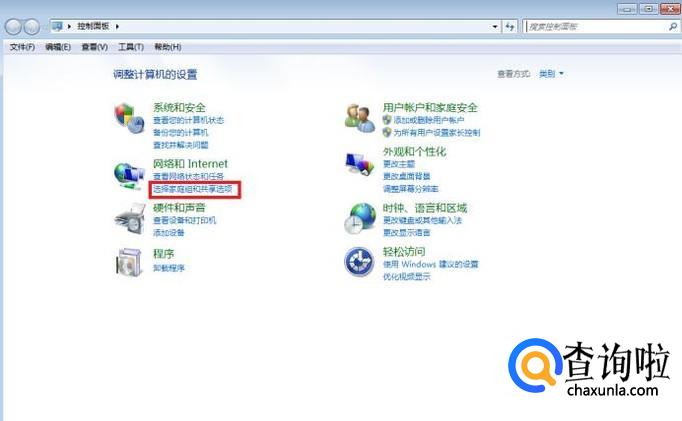 在控制面板中,点击“网络与Internet”下属的“选择家庭组和共享选项”。