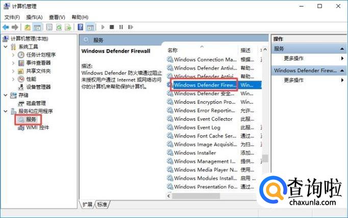 弹出的界面,我们点击服务,然后我们双击Windows Defender Firewall;