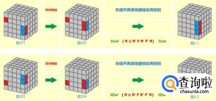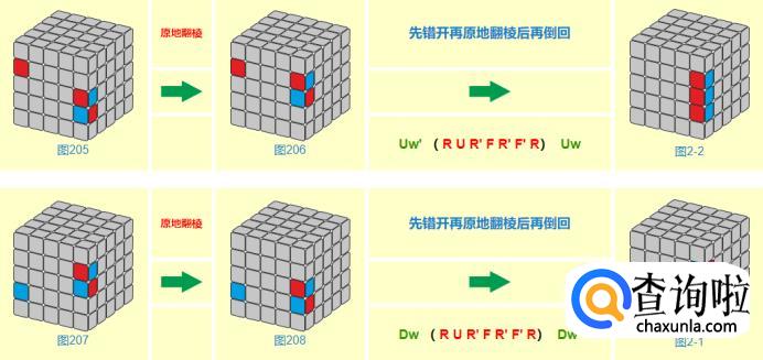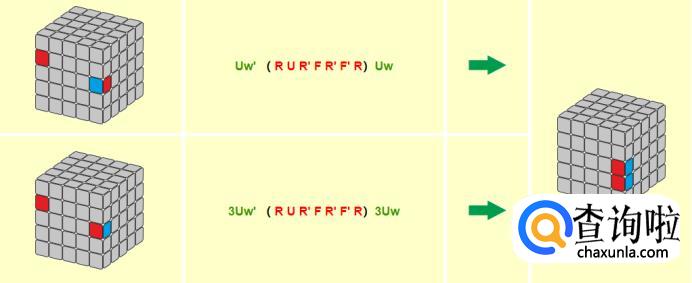 五阶魔方一组棱是有3个棱块组成,两侧的棱块命名为外棱块,中间的棱块命名为内棱块;五阶魔方在还原一组棱块的时候,先找到一组棱的内棱块和外棱块,摆放好位置(内棱块放右侧,外棱块放在左侧)如下图示: