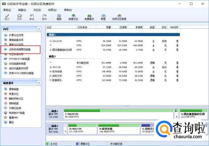 这里以分区助手软件为例,打开分区助手软件,点击页面左侧“迁移系统到固态硬盘”选项。