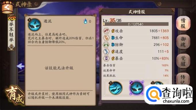 首先我们来看式神的面板属性如何,荒创之主的面板属性中暴击攻击以及速度都是S,但在SSR式神中输出式神这三项基本上都是S相差不大,重点是荒川之主的防御和生命都是B,这就意味着荒川之主不是脆皮式神,要肉一些,其他的SSR这两项为C的很多。