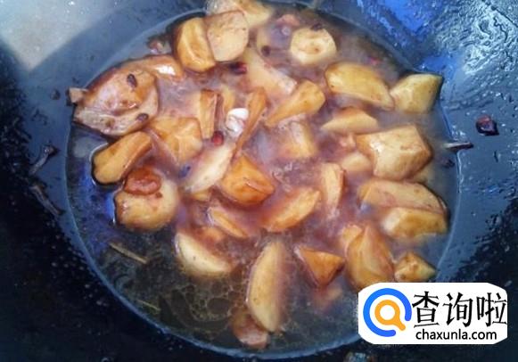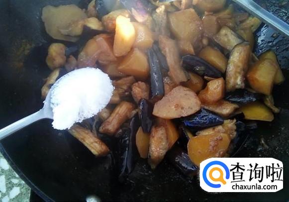 土豆炖煮到用勺子能切断后,放入茄段翻炒,然后依次放入适量生抽和糖、盐翻炒调味。