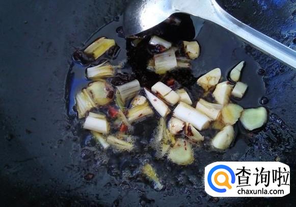 锅内放入宽油,油温七成热时放入葱段,蒜块、姜片、八角、一小勺豆瓣酱爆锅。