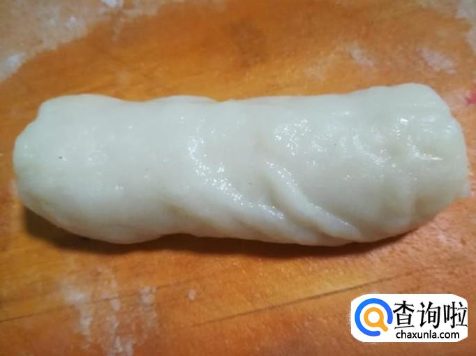 再把粘糕坯放案板上,搓成一个长条。
