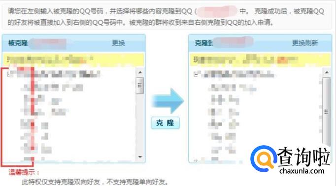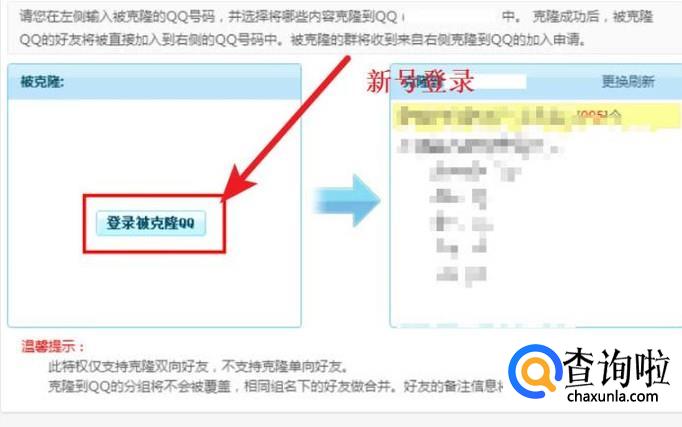 然后会弹出一个页面,如图所示,左侧登录被克隆的QQ,右侧是新QQ号。