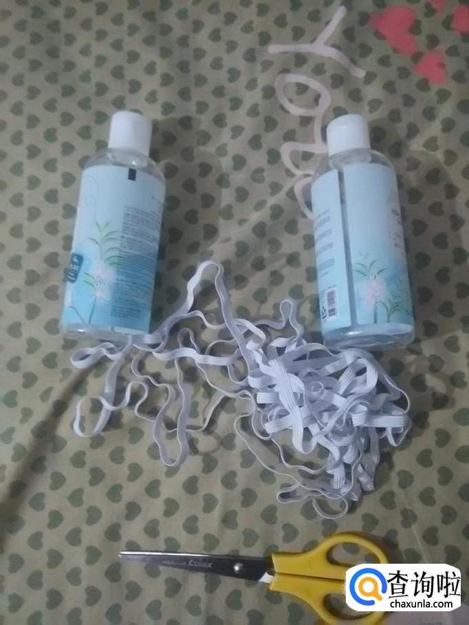 准备两个一样的瓶子,再准备一团松紧带和一把剪刀。