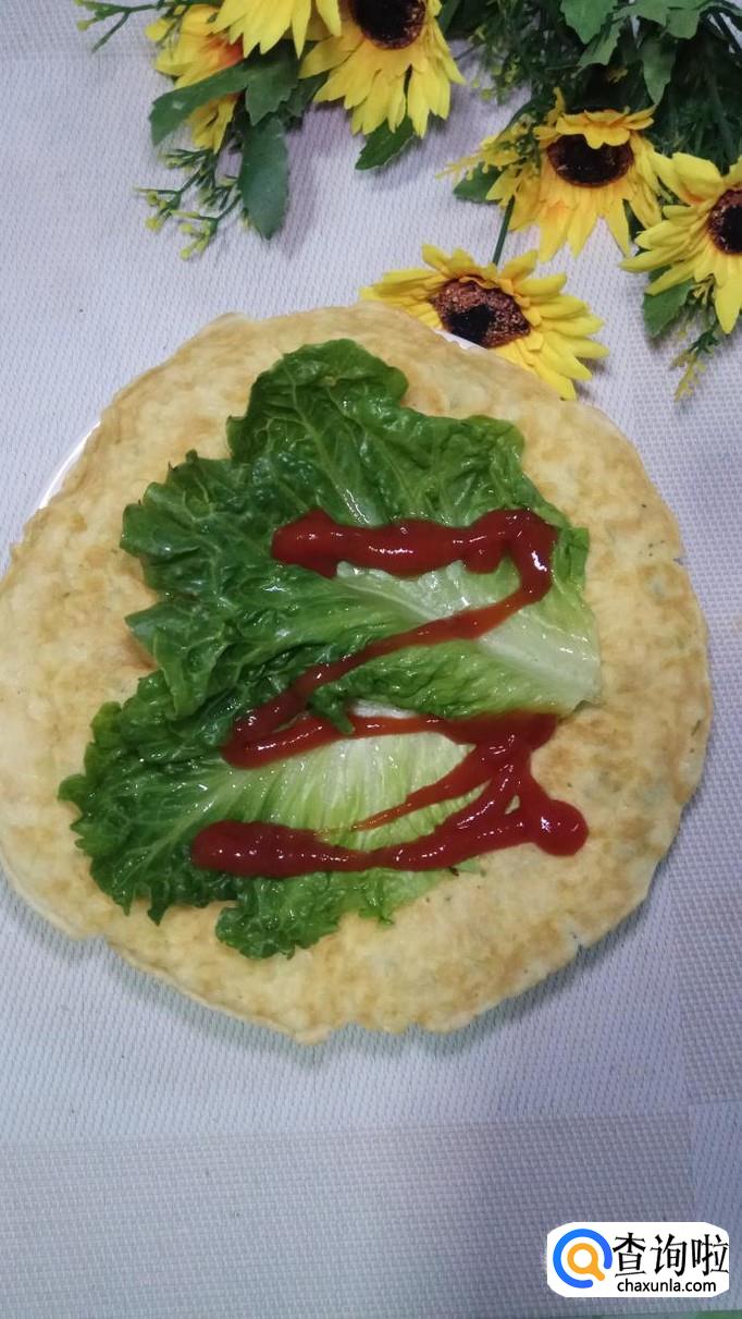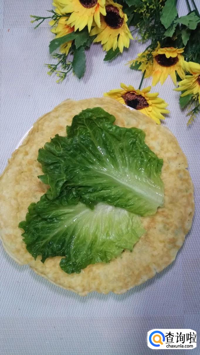 出锅装盘,再准备两片生菜,洗净后,放在饼上面,脆脆的生菜,配上饼更加好吃。