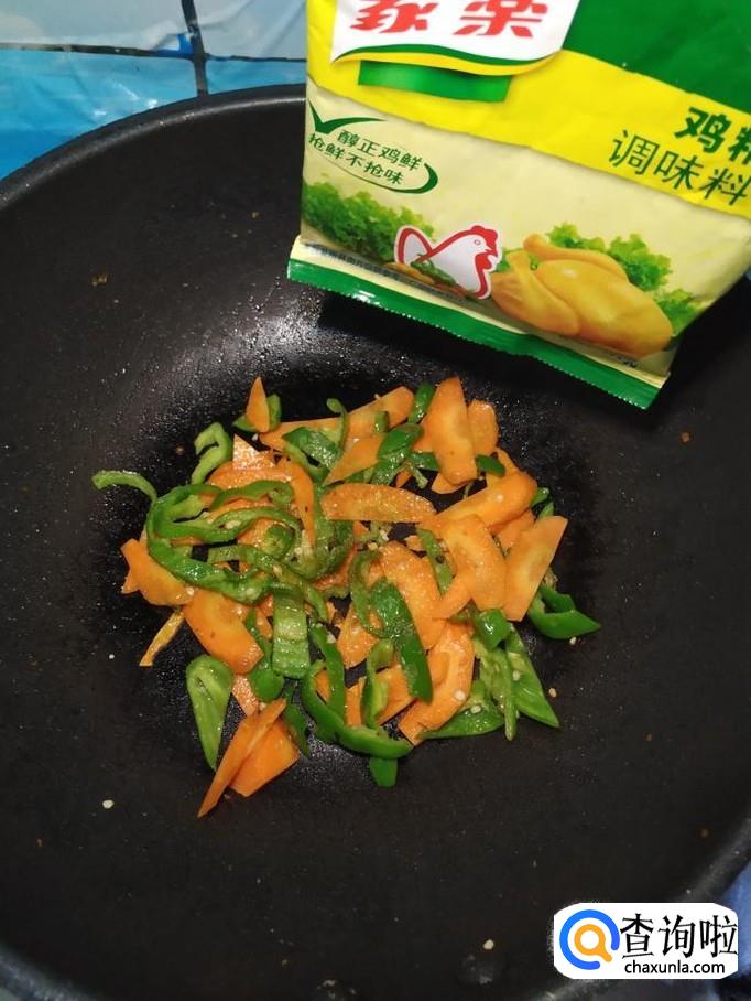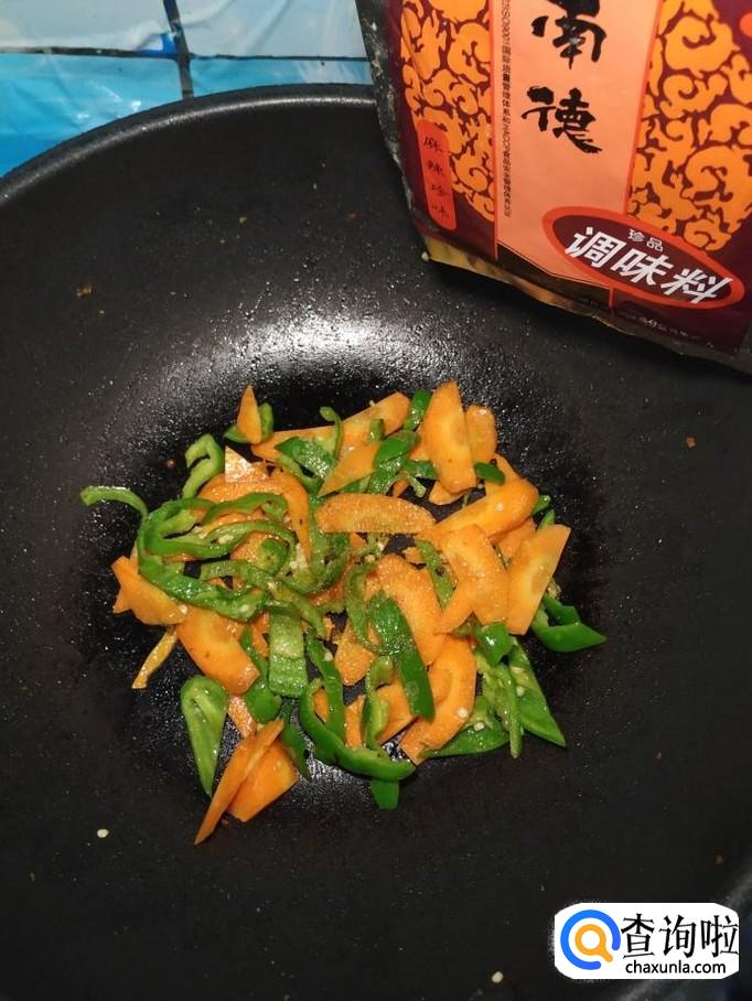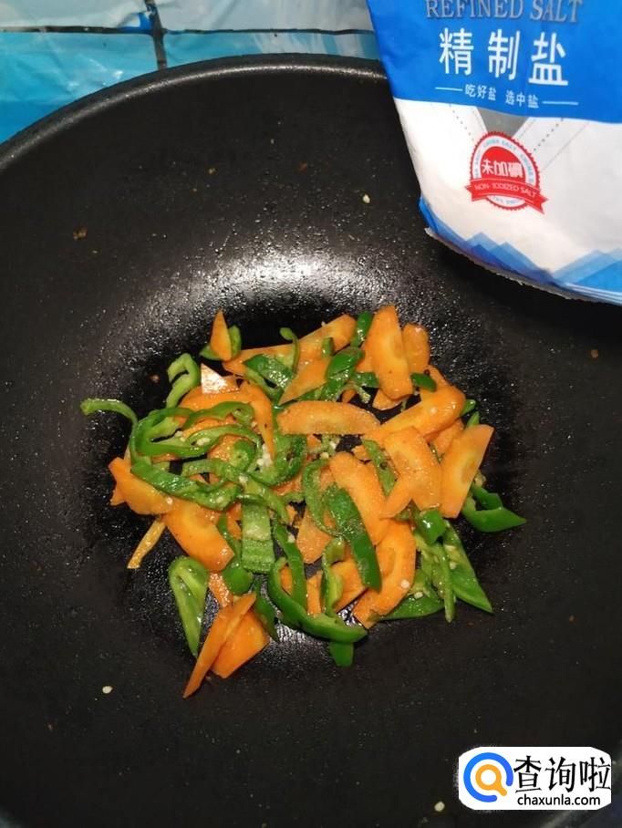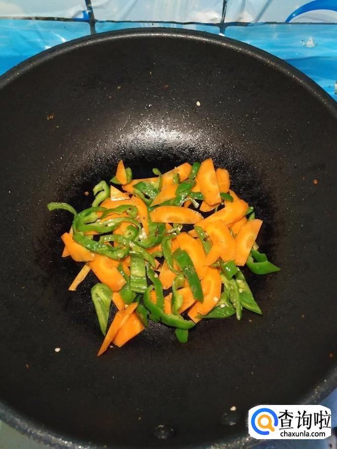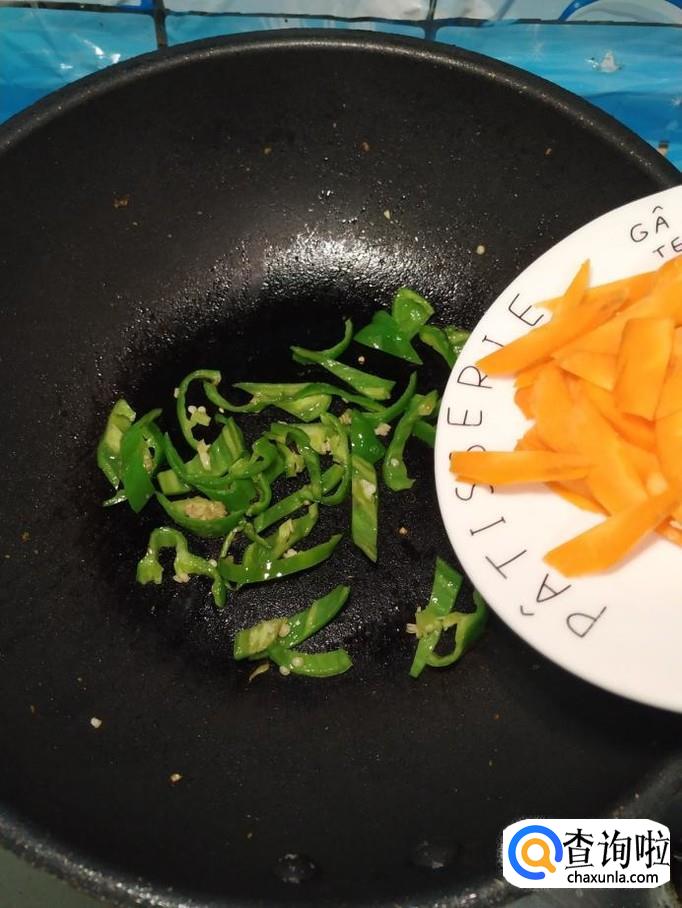 炒锅中再放入少许油,然后将青椒倒入锅中炒香,然后将胡萝卜片倒入锅中,与青椒一起翻炒,炒至食材变软就差不多了。