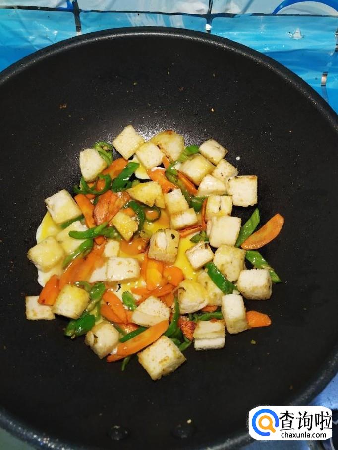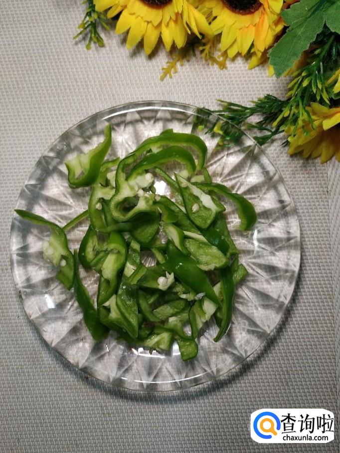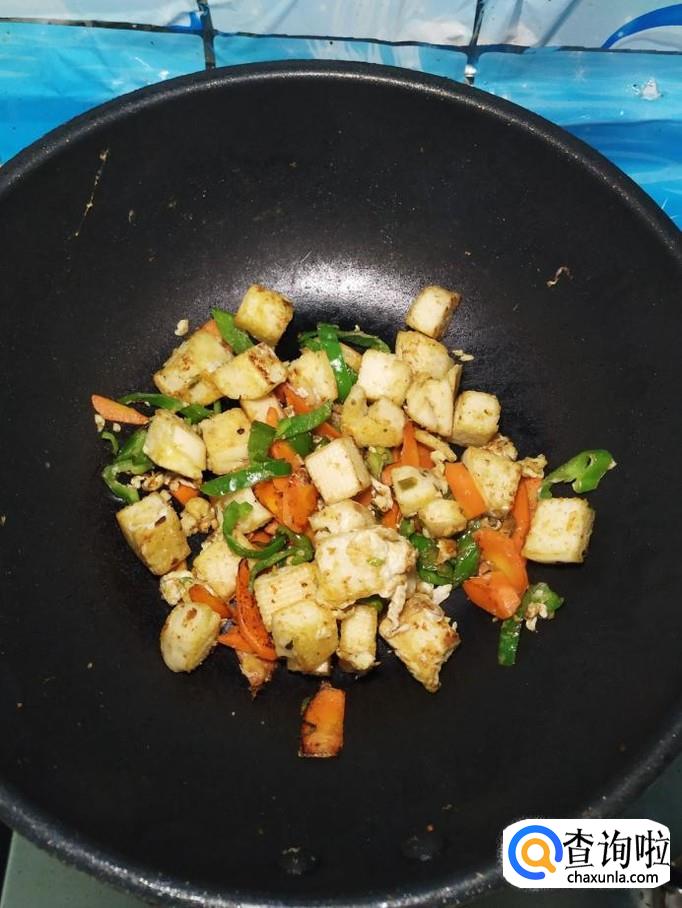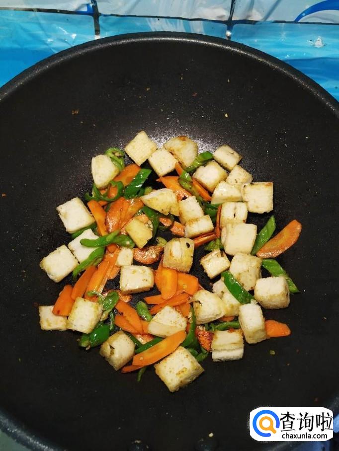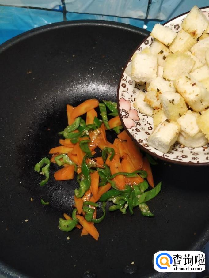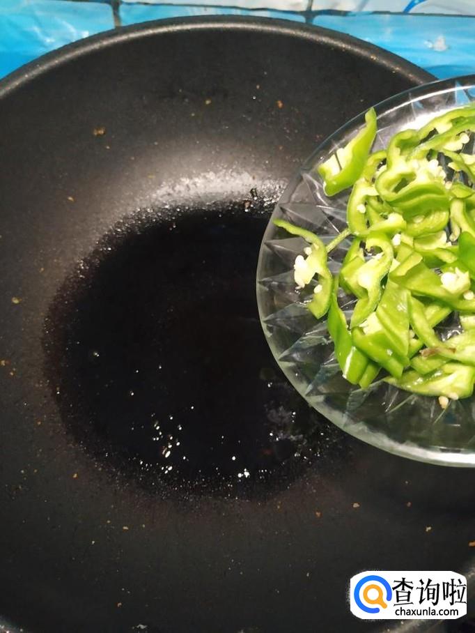 炒锅中再放入少许油,然后将青椒倒入锅中炒香,然后将胡萝卜片倒入锅中,与青椒一起翻炒,炒至食材变软就差不多了。