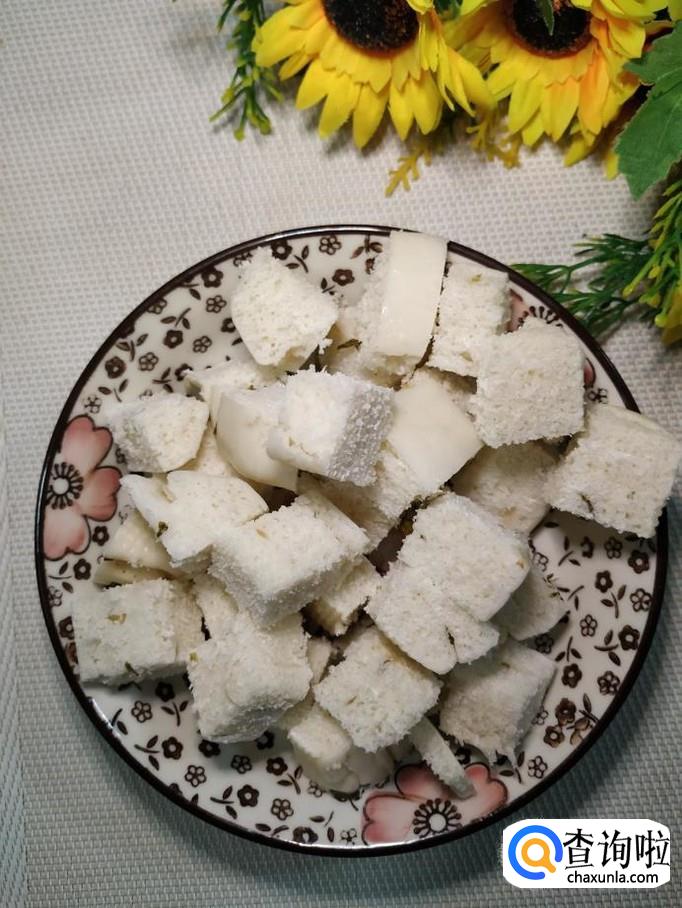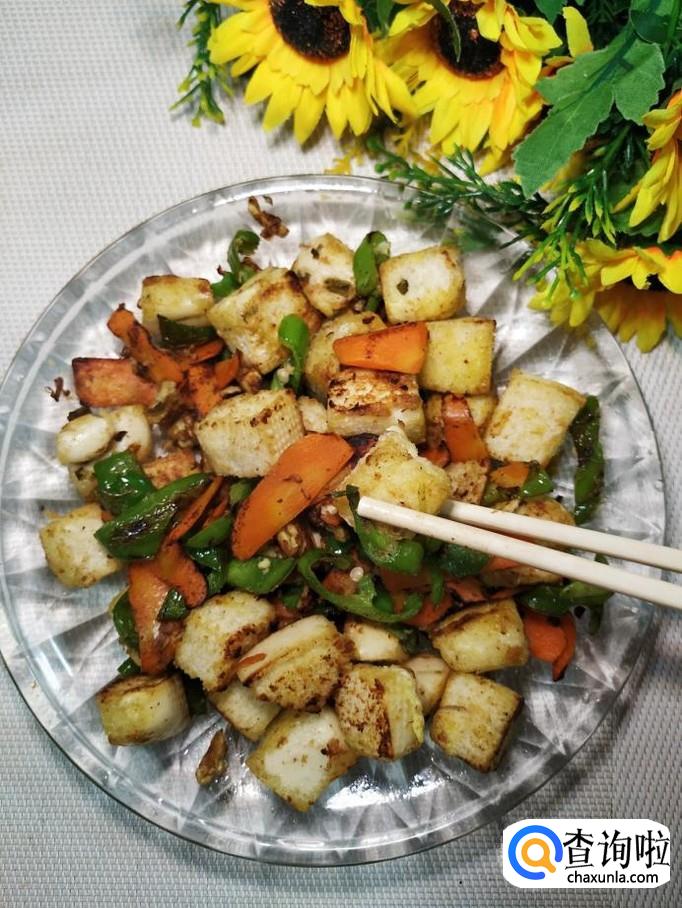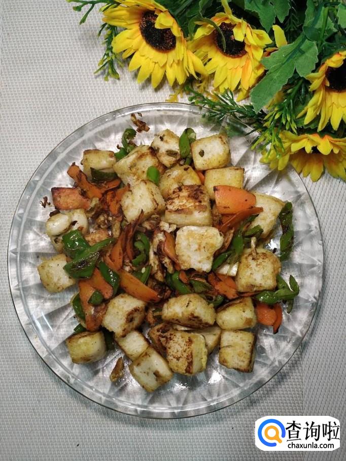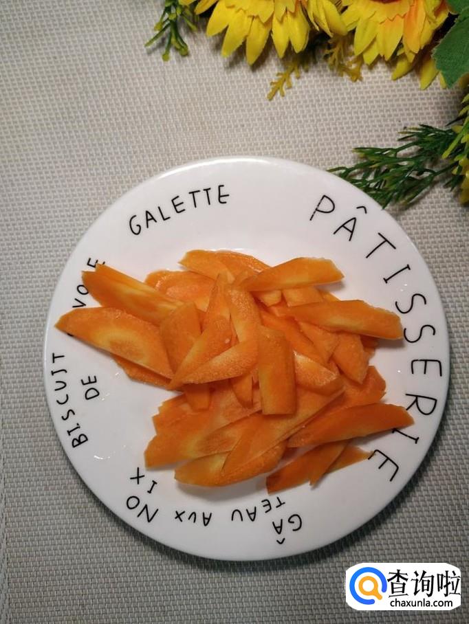 将花卷切成方块,新鲜的花卷,需要放冰箱冷藏之后再切;将胡萝卜去皮后,切成片,青椒切成丝,放入盘中备用。