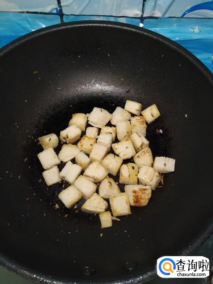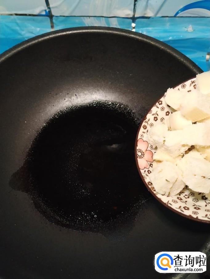 炒锅中放入适量油,油热后,将准备好的花卷儿块,倒入锅中,炒至表面金黄,盛出备用。