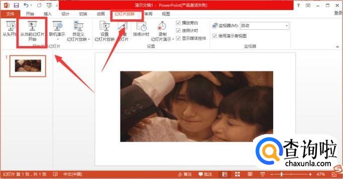 GIF图片的动画效果需在幻灯片放映的时候才能显现出来,此时点击工具栏的“幻灯片放映”,选择“从当前幻灯片放映”。若需要看其他幻灯片的放映效果可选择“从头放映”。