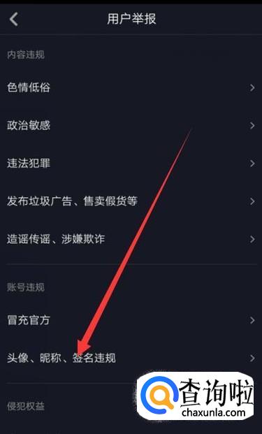 进入之后,选择举报内容,以图示内容为例,点击并进入。