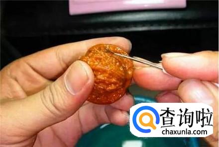 打开袋子,开裂的地方基本上看不出来了,然后用针蘸取一点透明胶,放进还有一点裂缝的地方,这样文玩核桃就修复好了。