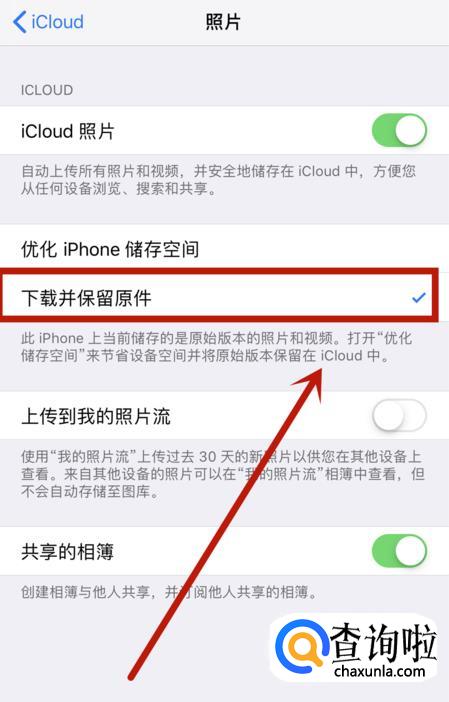 找到【优化 iphone 储存空间】选项。将【优化 iphone 储存空间】选项更改为【下载并保留原件】。