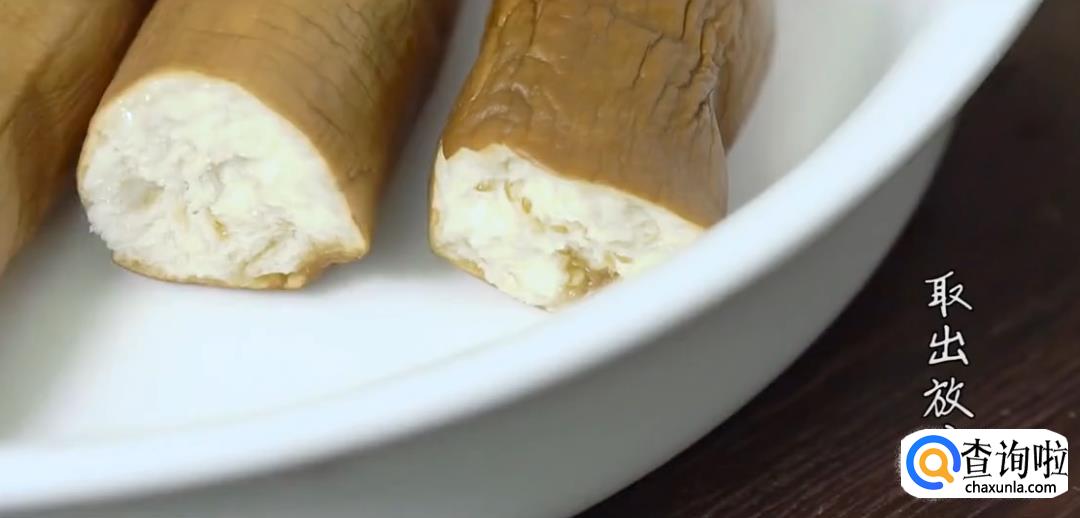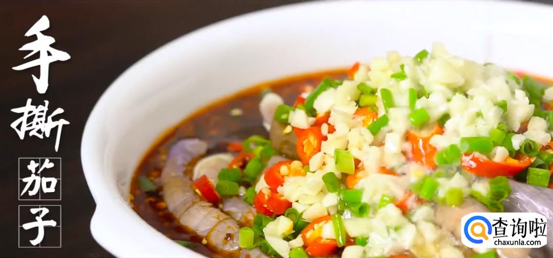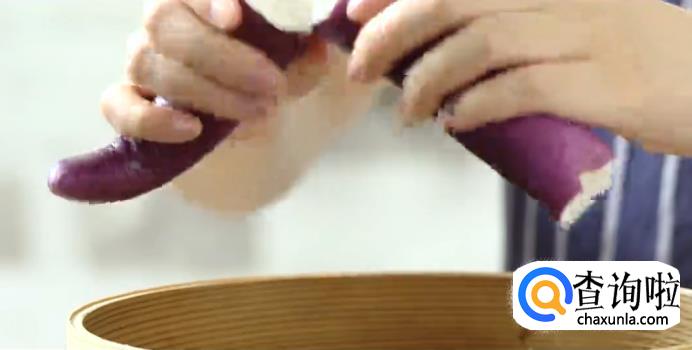 茄子分段上蒸锅蒸熟后撕开。