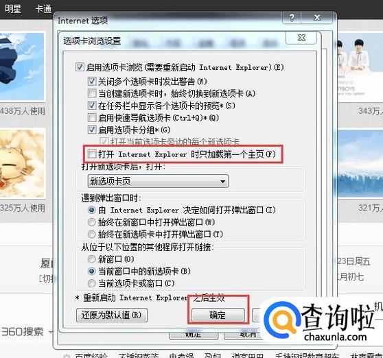 打开Internet Explorer时只加载第一个主页前面打上勾,如下图所示: