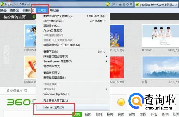 在浏览器上方找到【工具】,然后选择【Internet选项卡】,如下图所示: