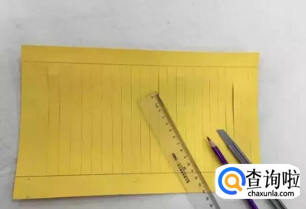 如下所示,长方形卡纸两端留一部分空隙,中间部分均匀裁切成细条。