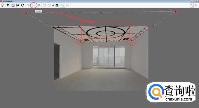 重新进入套型图编辑模式,右键激活选区,选择透视调整,固定CD两点,拉伸AB两点,使中间圆形越来越圆,调整完毕后,鼠标右击区域,点击保存按钮;