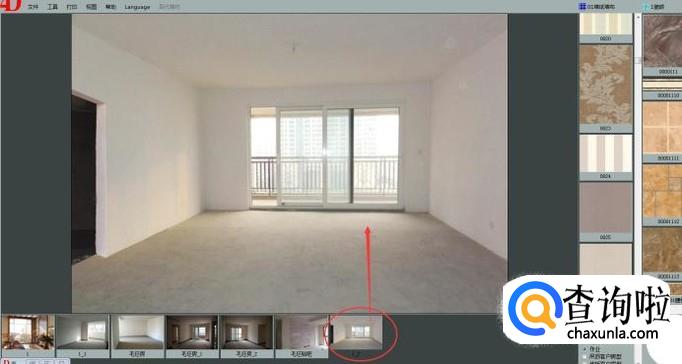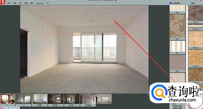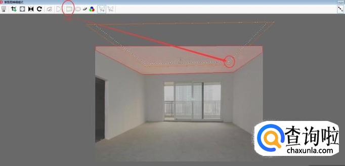 最后进入套型图编辑模式,选择“门洞”功能,以刚才的D点区域为起点,鼠标一直按住左键画出合适大小矩形框,松开手后外推使矩形框内凹。回到软件主界面后,点击毛坯房顶任一区域,都会出现虚线矩形框,如图所示;