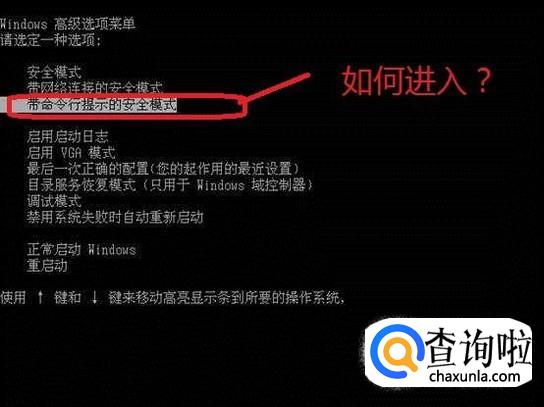 出现如下启动菜单,我们看到有三个版本的安全模式可以选择,键盘方向键可以上下移动光标,我们移到“带命令行提示的安全模式”,按回车键确定。