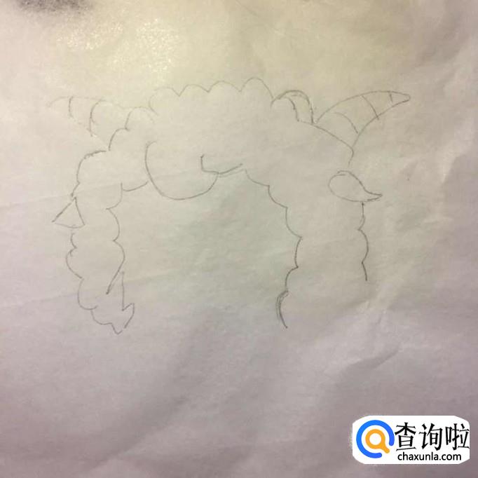 首先用铅笔在一四纸上画出喜羊羊的羊角、耳朵和头发,如下图所示。画喜羊羊羊角的时候可以把它们想象成两个笋的形状。画喜羊羊的头发的时候可以画的左边少一点,右边多一点。