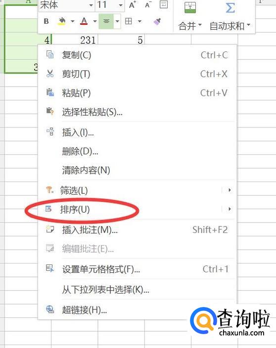 如图,我们也可以在选中区域单击鼠标右键,选择排序即可