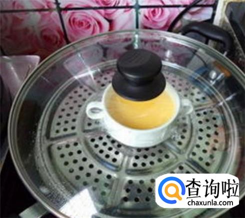 鸡蛋液打好之后,锅里加清水并放上蒸格,将鸡蛋液放进去,用保鲜膜覆盖住碗口,或者用另一个碗扣住开火蒸。