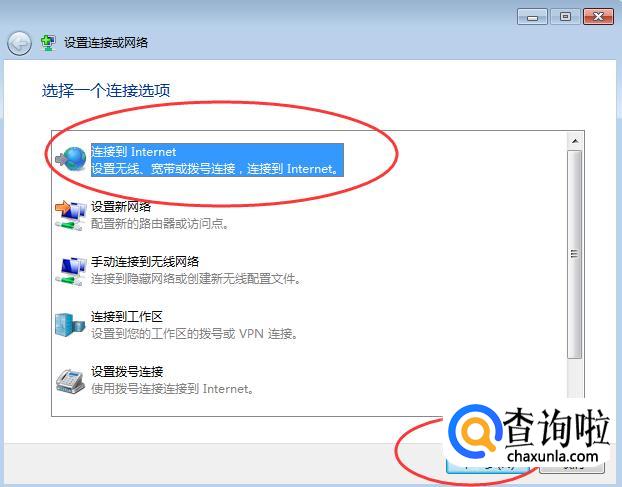 点击第一个“连接到Internet”,然后点击“下一步”,如下图。