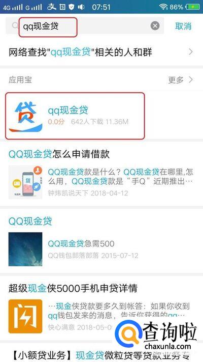 在搜索栏输入“QQ现金贷”字样,返回如图所示结果,找到正规的QQ现金贷平台。