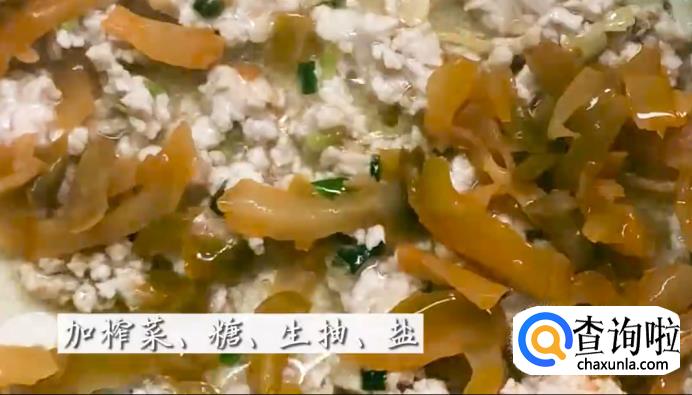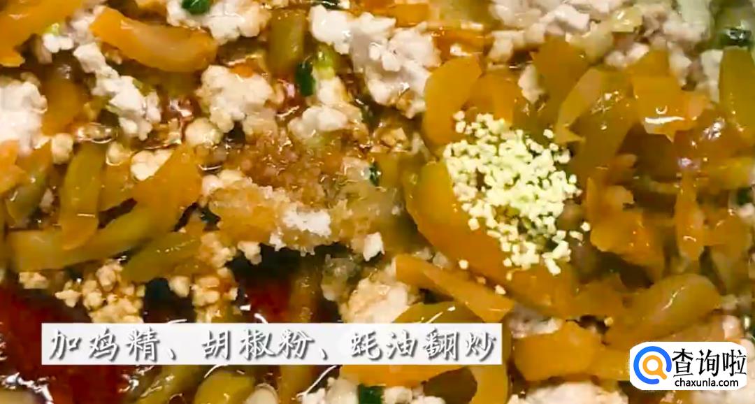 加榨菜、糖、生抽、盐、鸡精、胡椒粉和蚝油继续翻炒。