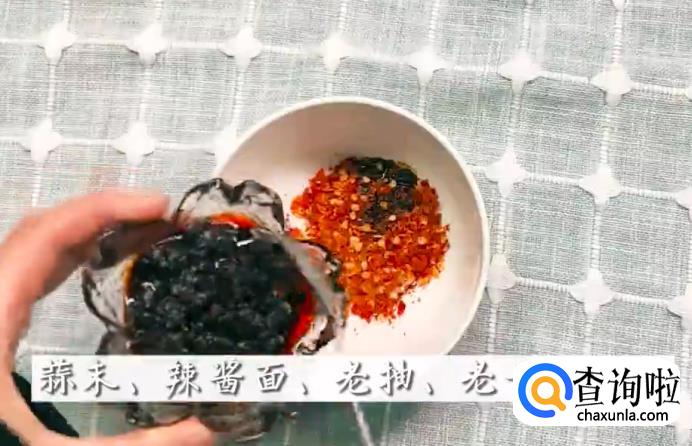 取一个干净的碗,制作老干妈酱料:放入蒜末、辣椒面、老抽、老干妈搅匀。