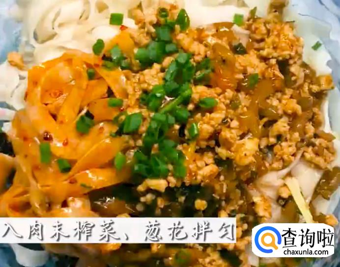 在煮好的面条上,放上老干妈酱料、肉末榨菜、葱花拌匀。
