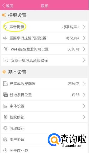 点击“提醒设置”里的“声音提示”进入铃声修改界面。