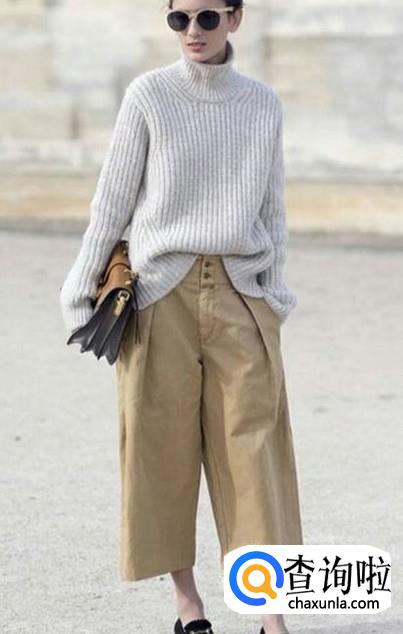 毛衣+阔腿裤:厚厚的毛衣慵懒自在,这时搭配一条棉质厚实的阔腿裤,脚上穿一双平底鞋,舒服而悠闲。